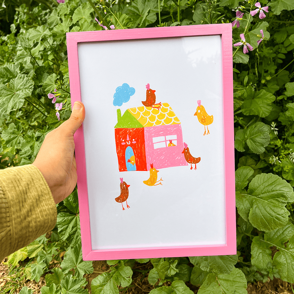 Print enmarcado casita con gallinas , marco de madera mañio, pintado con pintura rosada y luego barniz brillante.