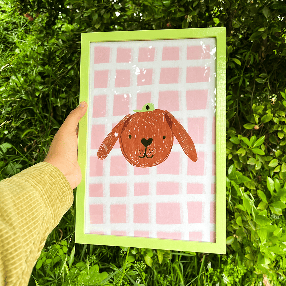 Print enmarcado de gato gris, marco de madera mañio, pintado con pintura verde y luego barniz brillante.